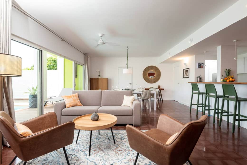 Spacieux et confortable, ce logement de 100 m² pouvant accueillir jusqu'à 6 hôtes dispose de deux chambres climatisées avec un grand lit double et balcon, de 2 salles d'eau et 3 WC, d'une cuisine américaine tout équipée et d'un salon avec canapé-lit, ainsi que d'un cellier, de la télévision satellite et d'une connexion internet .